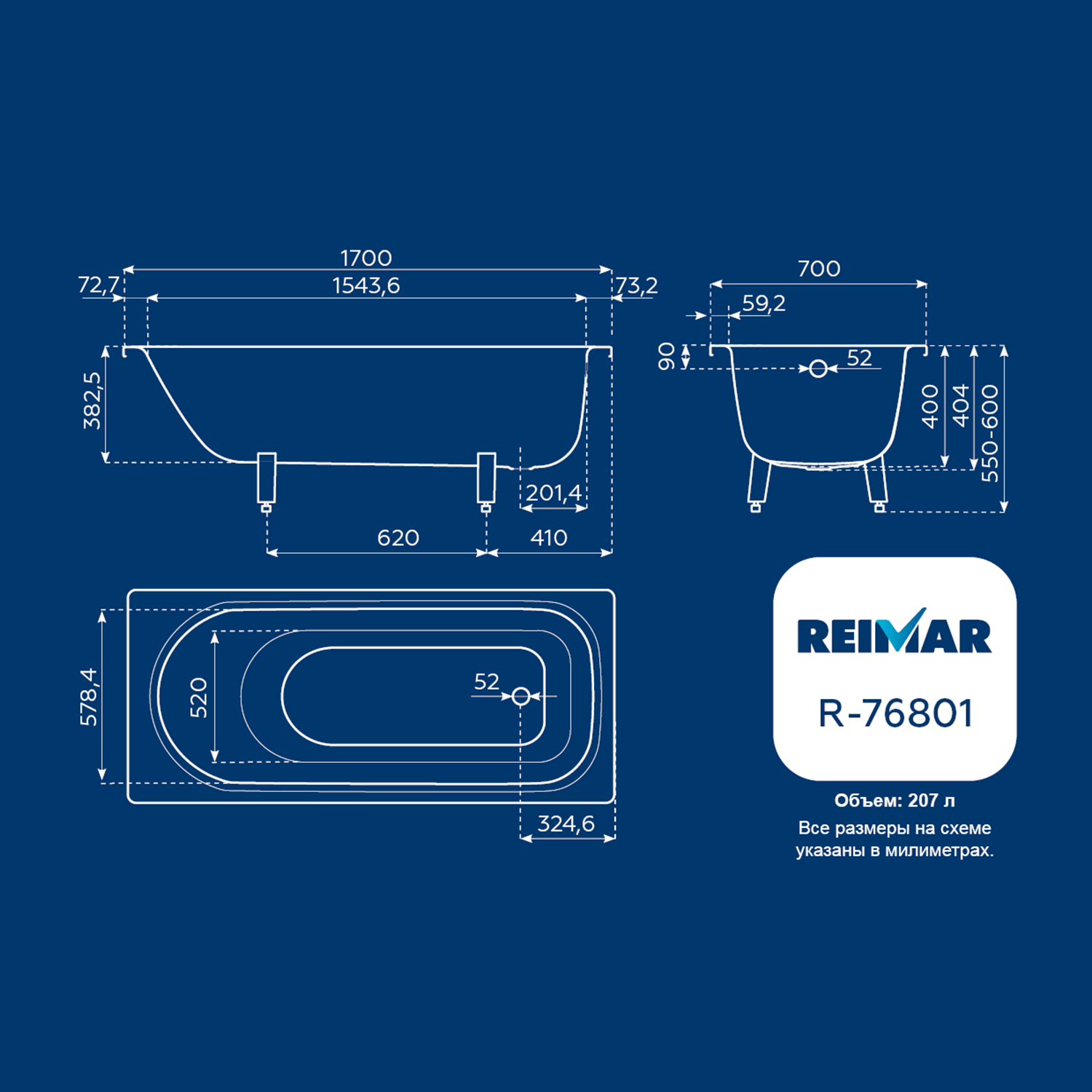 - Толщина обновленного Reimar - до 6,3 мм (ранее до 6 мм), в том числе толщина стали до 2 мм и эмали до 0,7 мм. Для того, чтобы можно было убедиться в ее прочности и долговечности, на ванну даётся гарантия – 15 лет.